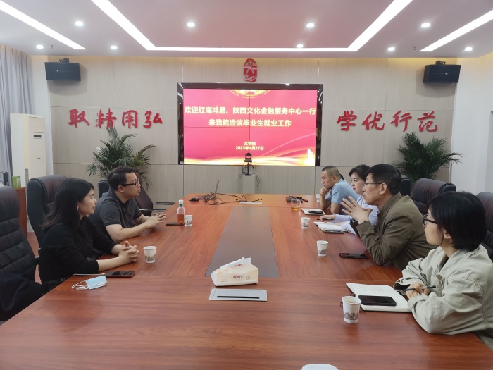 4月27日下午,陕西文化金融服务中心、陕西红海鸿易人力资源服务有限公司一行来开云官网文学院就学生就业工作进行调研座谈。招生就业处处长杨姗姗、文学院院长郝延军、党总支书记吴勃、副书记李莎莎参加,会议由副院长马娜...