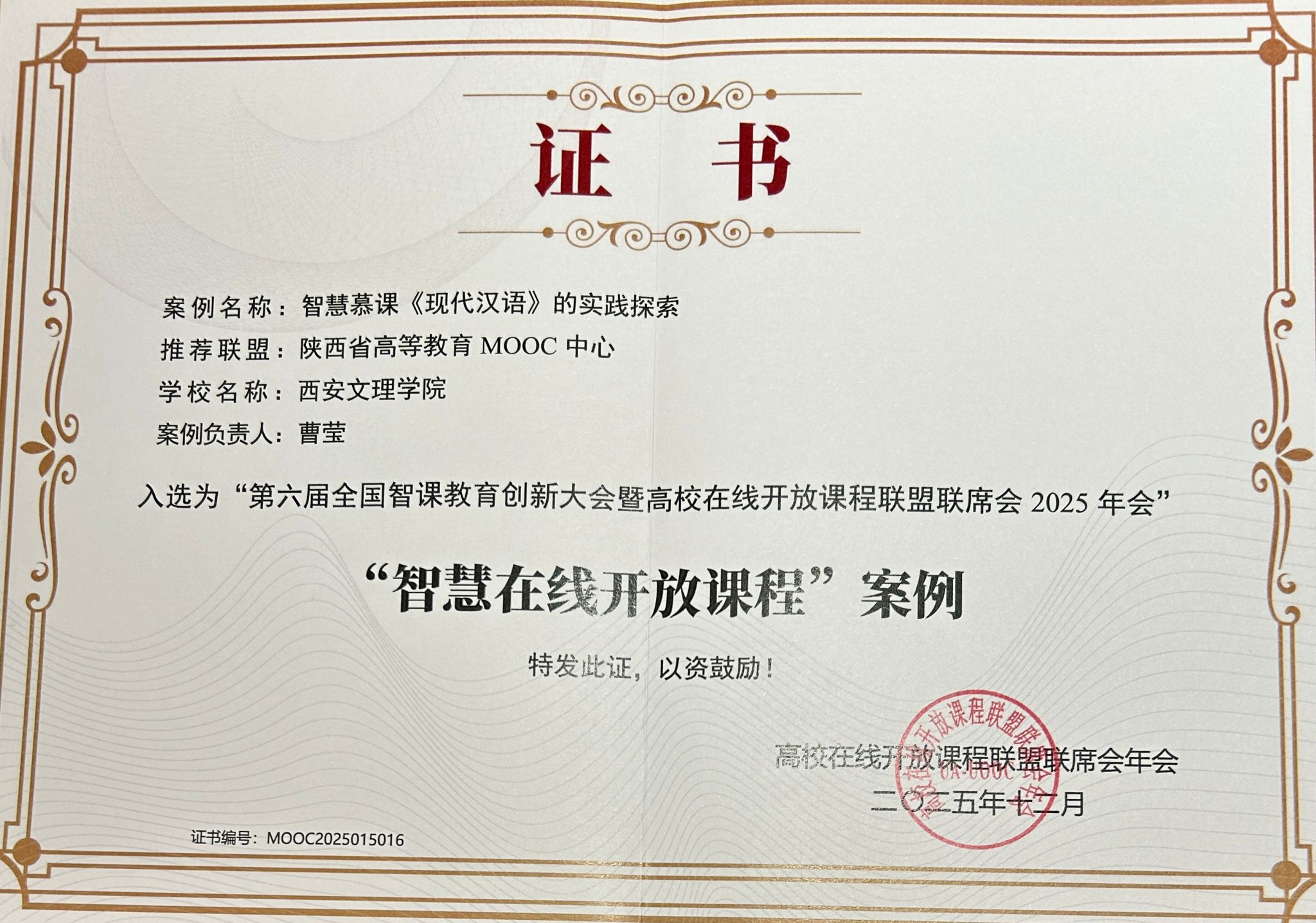 12月13日,第六届全国智课教育创新大会暨高校在线开放课程联盟联席会2025年会在武汉隆重召开,来自全国高校的500余名专家学者围绕"智慧课程引领AI课程建设新范式"进行深入研讨。在这一智慧教育领域的年度盛会上,师范学院曹莹教授主持的《现代汉语》课程入选第六届全国“智慧在线开放课程”优秀案例,该课程为国家一流线上课程,在中国大学慕课网和智慧课树双平台运行,选课高校102所,选课学生累计30146人。本次优秀案例全国共评选出120个,...