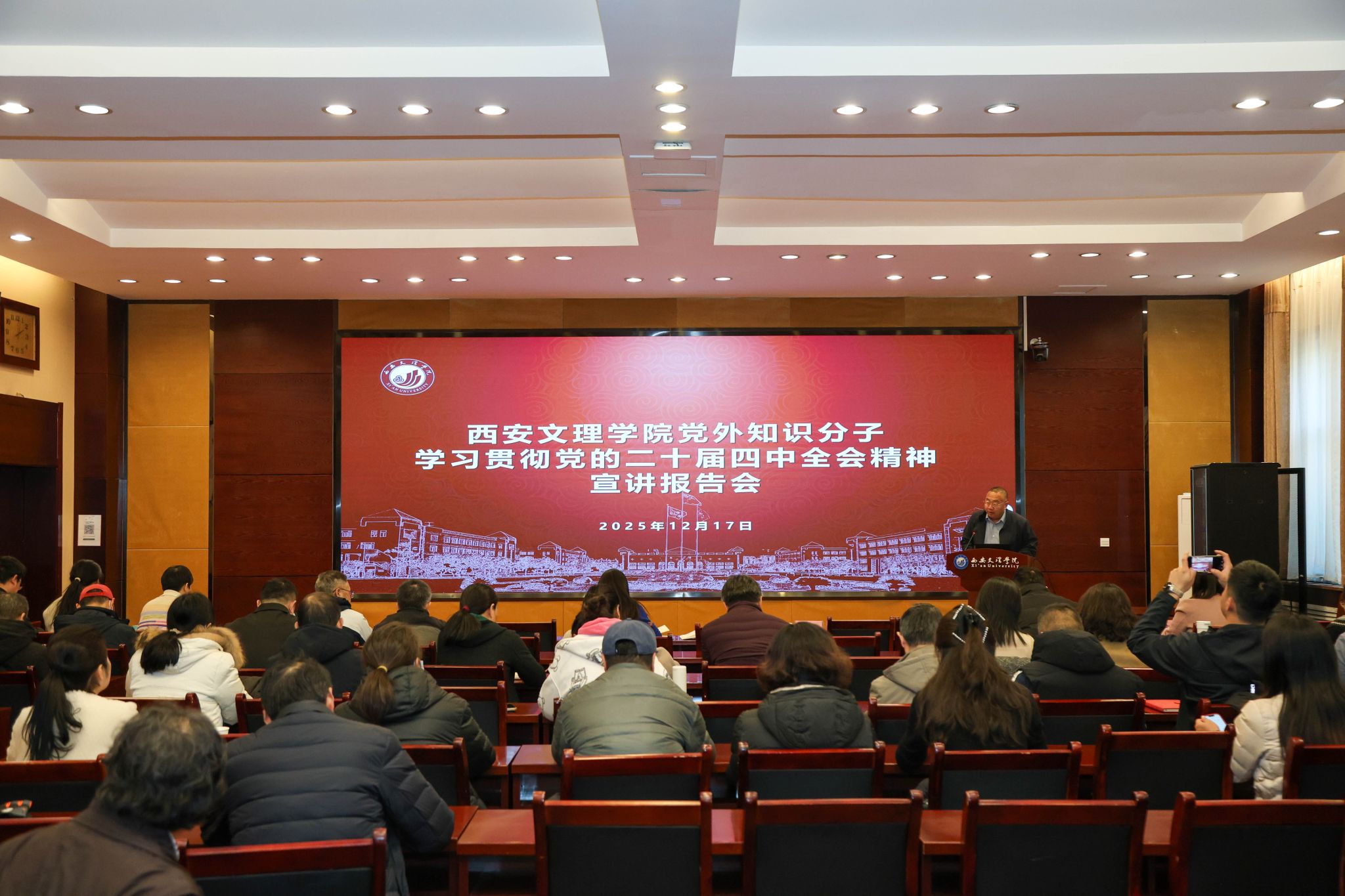 12月17日,开云官网召开党外知识分子学习贯彻党的二十届四中全会精神宣讲报告会,马克思主义学院申晓玲教授作专题报告,党委副书记任晖主持会议。报告会紧扣全会内涵,锚定“十五五”、立足“现代化”,从中国式现代化道路的历史必然性、本质特征、战略安排及勇担使命开创新局面四方面系统解读。申晓玲结合详实资料与鲜活案例,为参会人员精准把握全会精神提供了清晰指引。任晖在总结时提出三点要求:一是坚持学深悟透,将学习全会精神与高等教育决策部署结合,...