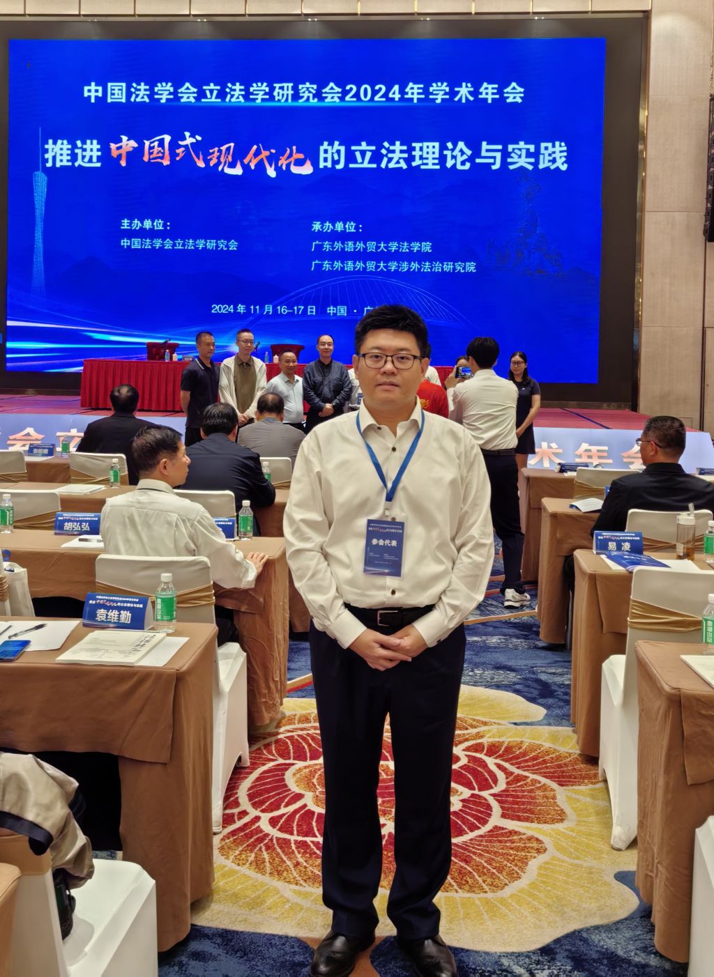 中国法学会立法学研究会2024年学术年会11月16日至17日在广州举行。本次会议的主题为“推进中国式现代化的立法理论与实践”,年会由广东外语外贸大学法学院、涉外法治研究院承办。中国法学会党组书记,全国人大常委会委员、宪法和法律委员会副主任委员王洪祥等出席年会开幕式作重要讲话。全国人大常委会委员、宪法法律委委员,中国法学会副会长、立法学研究会会长许安标同志主持开幕式。来自全国各地的400余位高等院校、科研机构和立法实务部门的专家学者、实务工作者参会。今年会jinnianhuicom法学系副教授张振宇受邀参加本次学术年会并作专题学术报告。