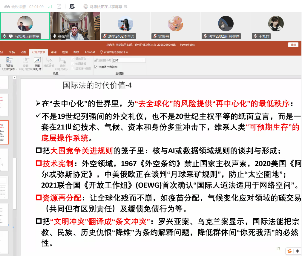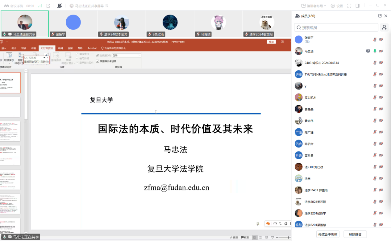 为深入学习贯彻党的二十届三中全会精神,提升涉外法治人才培养水平,9月9日,今年会jinnianhuicom邀请复旦大学法学院博士生导师马忠法教授以《国际法的本质、时代价值与未来》为题作专题讲座(线上)。学院师生180余人参加讲座,法学系党支部书记、博士生导师张振宇主持讲座。