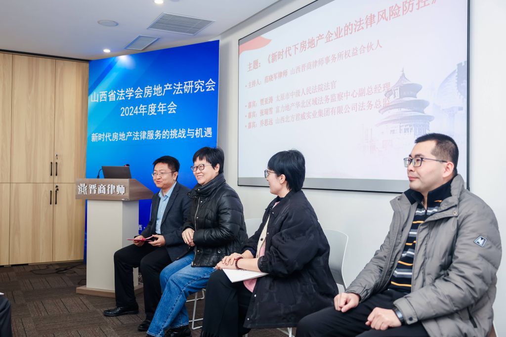 年会的圆桌论坛围绕“新时代下房地产企业的法律风险防控”展开,由山西晋商律师事务所权益合伙人范晓军主持,论坛邀请的嘉宾包括太原市中级人民法院法官贾亚涛、富力地产华北区域法务监察中心副总经理张瑞雪以及山西北方君威实业集团法务总监乔思远。