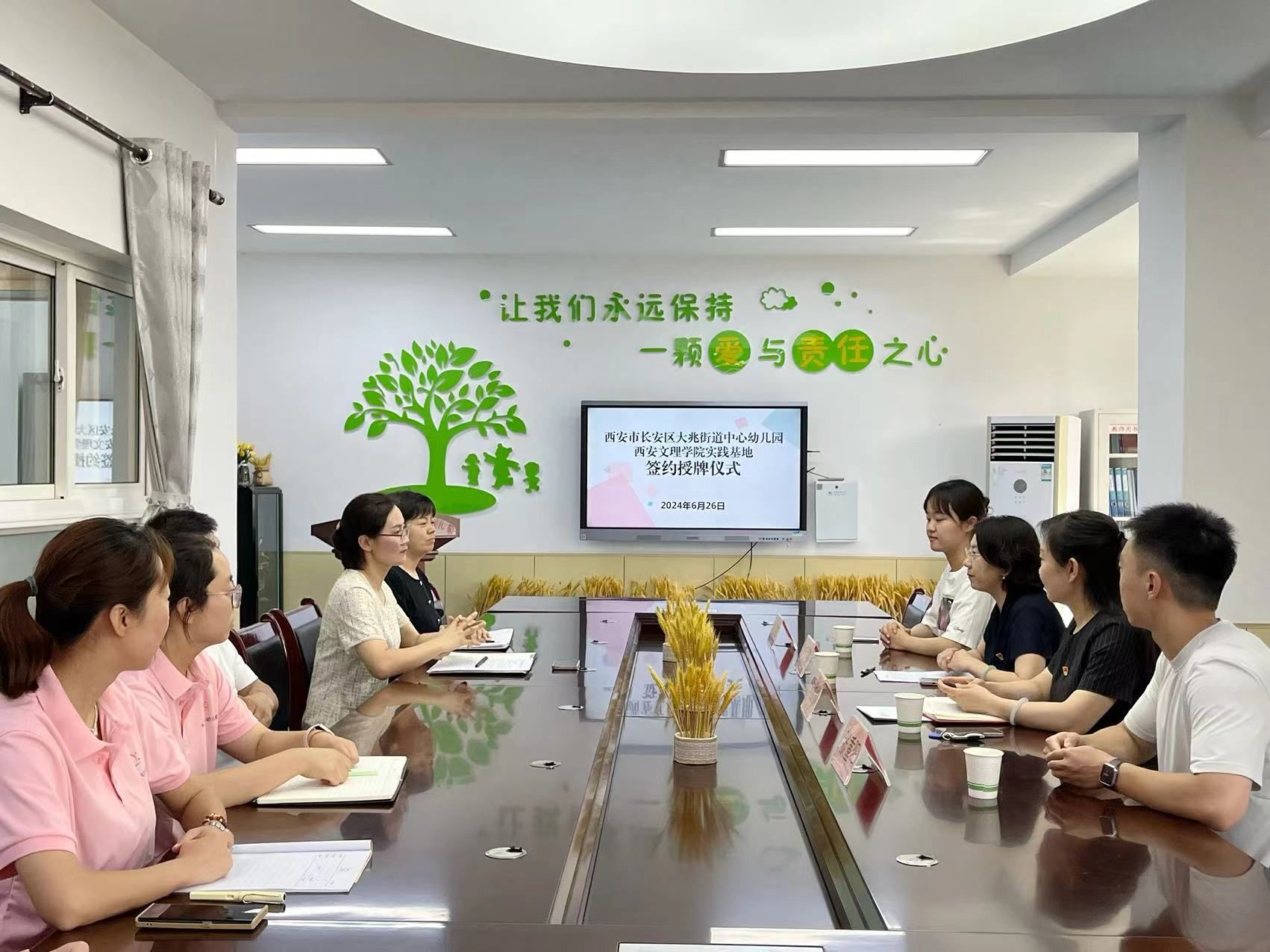 6月26日上午,学前教育学院党总支书记刘爱霞、党总支委员向维娜、辅导员张重阳、杜芷歆及四名学生代表一行,赴西安市长安区大兆街道中心幼儿园开展访企拓岗促就业活动。长安区大兆街道中心幼儿园园长李晶、副园长延晓晓、后勤主管成建峰等园方领导热情接待并参与了座谈交流。