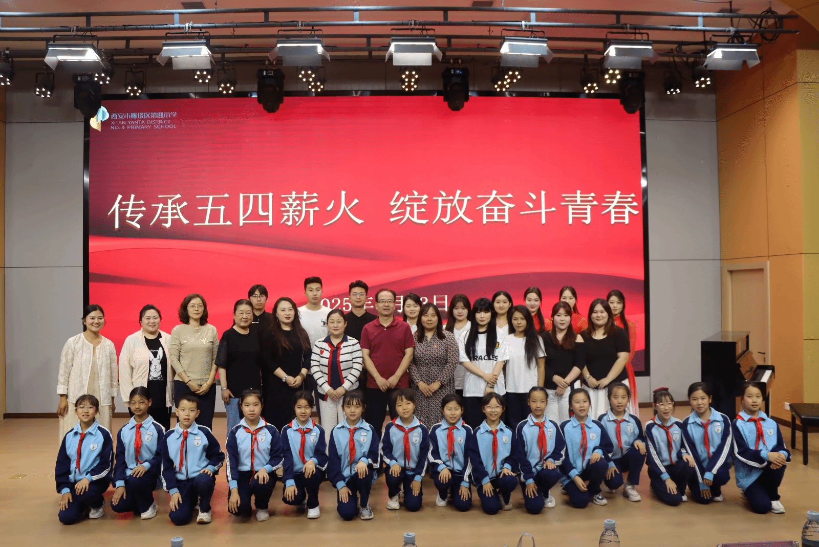 4月23日下午,音乐学院党总支赴西安市雁塔区第四小学携手开展了“传承五四薪火 绽放奋斗青春”艺术实践活动,西安市雁塔区第四小学校长文燕、音乐学院党总支委员高婧及双方师生代表共同参加此次活动。