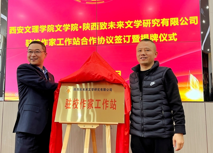 参会双方进行签约暨挂牌仪式,郝延军与王艺霖共同签定了合作协议,吴勃与白亮共同揭牌。此次驻校作家工作站的成立进一步促进了文学院与西安地方企业进行产学研合作,今后双方在合作中共同孵化学生成果,推动地方文化产业发展。