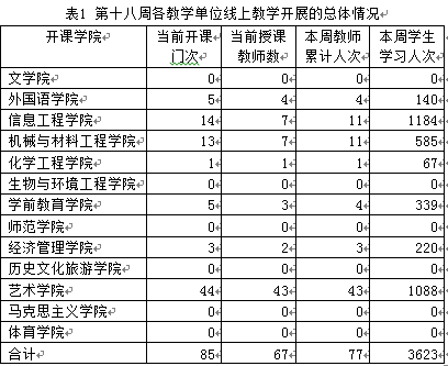 本学期全校教学计划安排947门课程,截止6月28日已开展线上教学的课程有872门(1735门次),占全部课程门数的92.08%。第十八周授课教师67人,累计授课77人次,开设线上课程85班次。第十八周各教学单位线上教学开展的总体情况如表1所示。