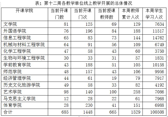 本学期全校教学计划安排947门课程,截止5月17日已开展线上教学的课程有816门(1675门次),占全部课程门数的86.17%,已有131门(227门次)课程已结课或理论部分已结课。第十二周授课教师685人,累计授课1529人次,开设线上课程1680班次。第十二周各教学单位线上教学开展的总体情况如表1所示。