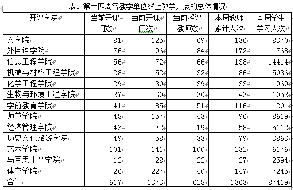 本学期全校教学计划安排947门课程,截止5月29日已开展线上教学的课程有825门(1686门次),占全部课程门数的87.12%,已有208门(313门次)课程已结课或理论部分已结课。第十四周授课教师628人,累计授课1363人次,开设线上课程1479班次。第十四周各教学单位线上教学开展的总体情况如表1所示。