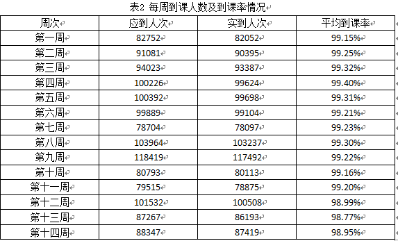 根据课程安排,应参加在线学习的学生9629人,其中第十四周应参加在线学习的学生88347人次,实际上课人数87419人次,平均到课率为98.95%。每周到课人数及到课率情况如表2所示。