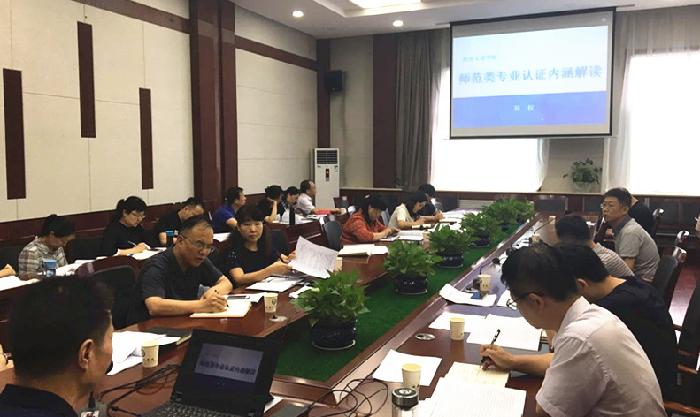 为贯彻落实《教育部关于印发< 普通高等学校师范类专业认证实施办法(暂行)>的通知》文件精神,顺利开展开云官网师范专业认证工作,7月10日下午,副校长韩权在办公楼会议中心第四会议室主持召开师范专业认证工作会。教务处、学生处、招就处、人事处、计财处、国资处、图书馆负责人,开办师范类专业学院院长、教学副院长、专业负责人等40余人参加了会议。