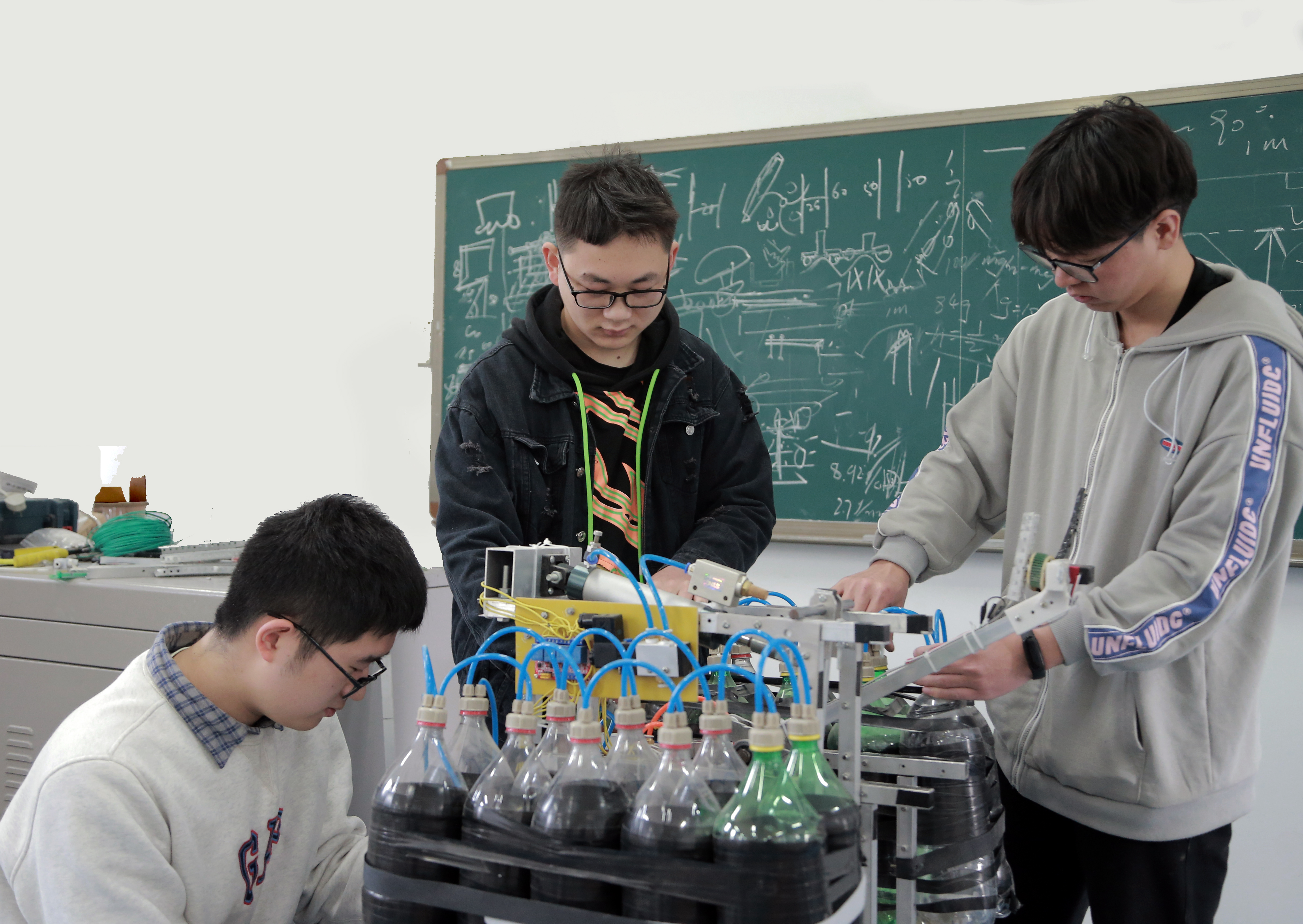 为了打造出最完美的的机器人,小组内常常因为思维方式和技术方案不统一产生“矛盾”,一次次讨论、一次次实验全部推翻,不同意见相互碰撞,不厌其烦地努力寻找最为可行的方案。“行百里者半九十”,越是临近出征,机器越会出现各种不可预期的问题,赛前的紧急调试更需要队员有一颗强大的心脏。在这个并不“高端”的实验室里,AIR(VEX)机器人战队间形成了相同的默契与信念,他们与机器人融为一体,共同心跳。