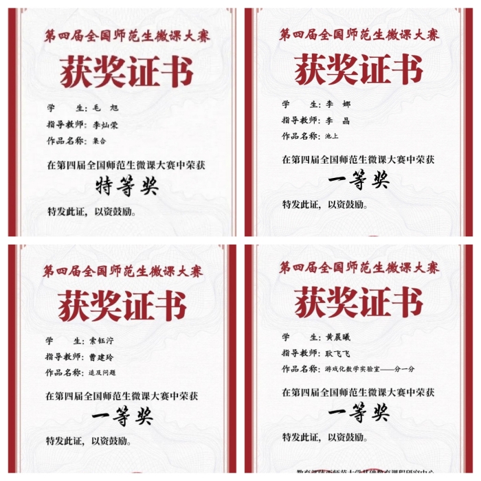在第四届全国师范生微课大赛中,师范学院参赛作品从来自全国162所院校的2703份作品中脱颖而出,荣获特等奖1项,一等奖3项,李灿荣被评选为优秀指导教师。