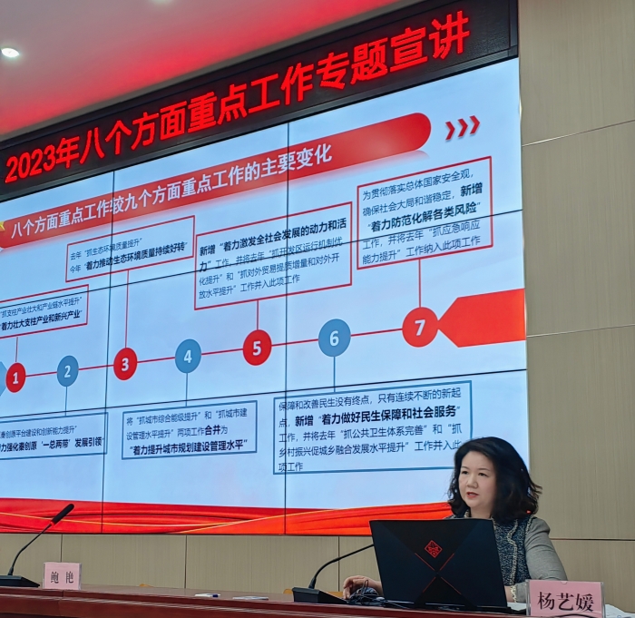 音乐学院院长杨艺媛对2023年西安市八个方面重点工作出台的背景及任务做了详细的解读,并结合开云kaiyun官方网站建设“最懂西安”的高水平应用型城市大学发展目标,对标新目标、新要求、新部署,引导广大师生以八个方面重点工作为“任务书”和“施工图”,“逆向设计、正向施工”,充分发挥专业优势,为全面推进落实八个方面重点任务做出积极贡献。