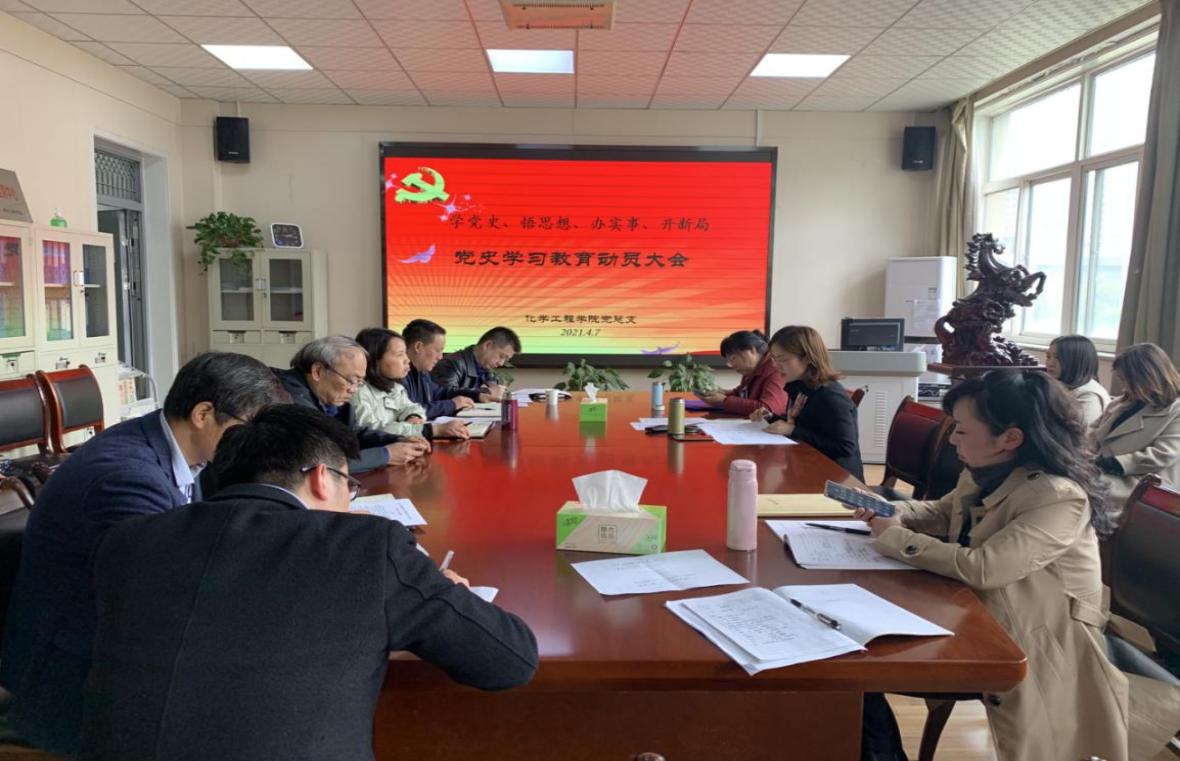 为深入开展党史学习教育,化学工程学院3月24日召开院领导领导党史学习教育专题会,4月6日召开了党支部书记党史学习专题会,4月7日组织全体党员教师学习习近平总书记在党史学习教育动员大会上的讲话精神,教育部党史学习教育动员大会精神,解读了党总支党史学习教育实施方案,为进一步学院推进党史学习教育打下坚实基础。