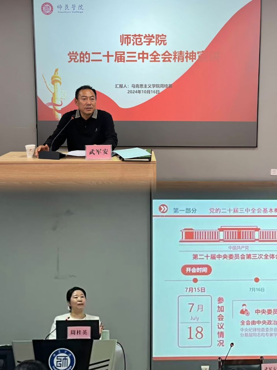 为深入学习贯彻党的二十届三中全会精神,准确把握全会提出的新理念、新思想、新战略,师范学院于10月16日在明德楼B202会议室召开了党的二十届三中全会精神宣讲会。此次宣讲会由师范学院党总支书记武军安主持,校宣讲团成员、马克思主义学院教师周桂英主讲,师范学院全体教职工参加。