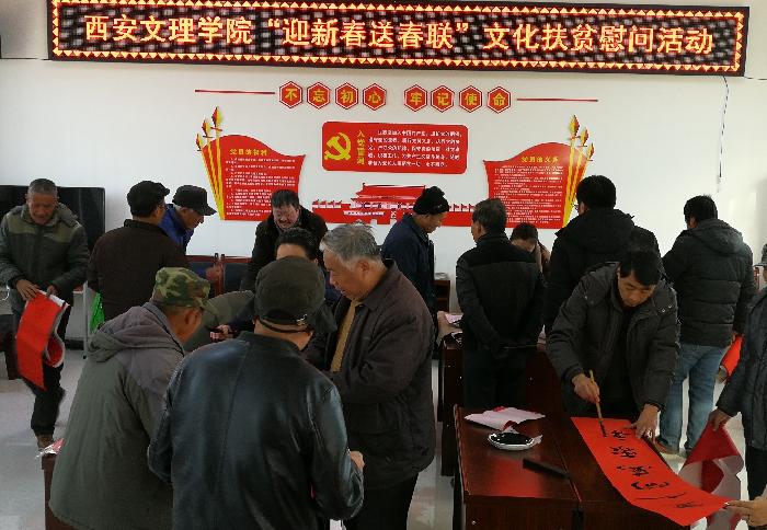 1月20日,学校扶贫办一行赴蓝田县冯家村看望慰问开云官网结对帮扶张军号、于继贤2位贫困户及驻村干部,并组织学校中国书画艺术研修中心马伟、田琛峰、高天成、何薇等老师为冯家村村民现场书写春联400余幅。