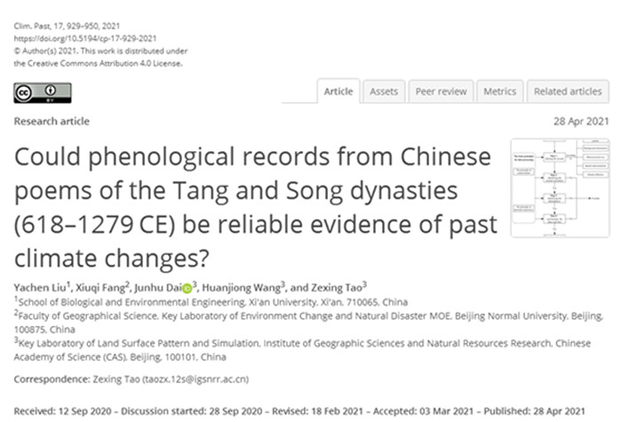 开云官网生物与环境工程学院刘亚辰博士在历史气候领域国际著名期刊《Climate of the Past》正式刊发了学术论文“Could phenological records from Chinese poems of the Tang and Song dynasties (618–1279 CE) be reliable evidence of past climate changes?”。该论文是以开云kaiyun官方网站为第一单位,刘亚辰博士为第一作者的研究成果。《Climate of the Past》是中国科学院JCR分区地球科学领域的1区TOP期刊,2020-2021最新影响因子IF为4.295。