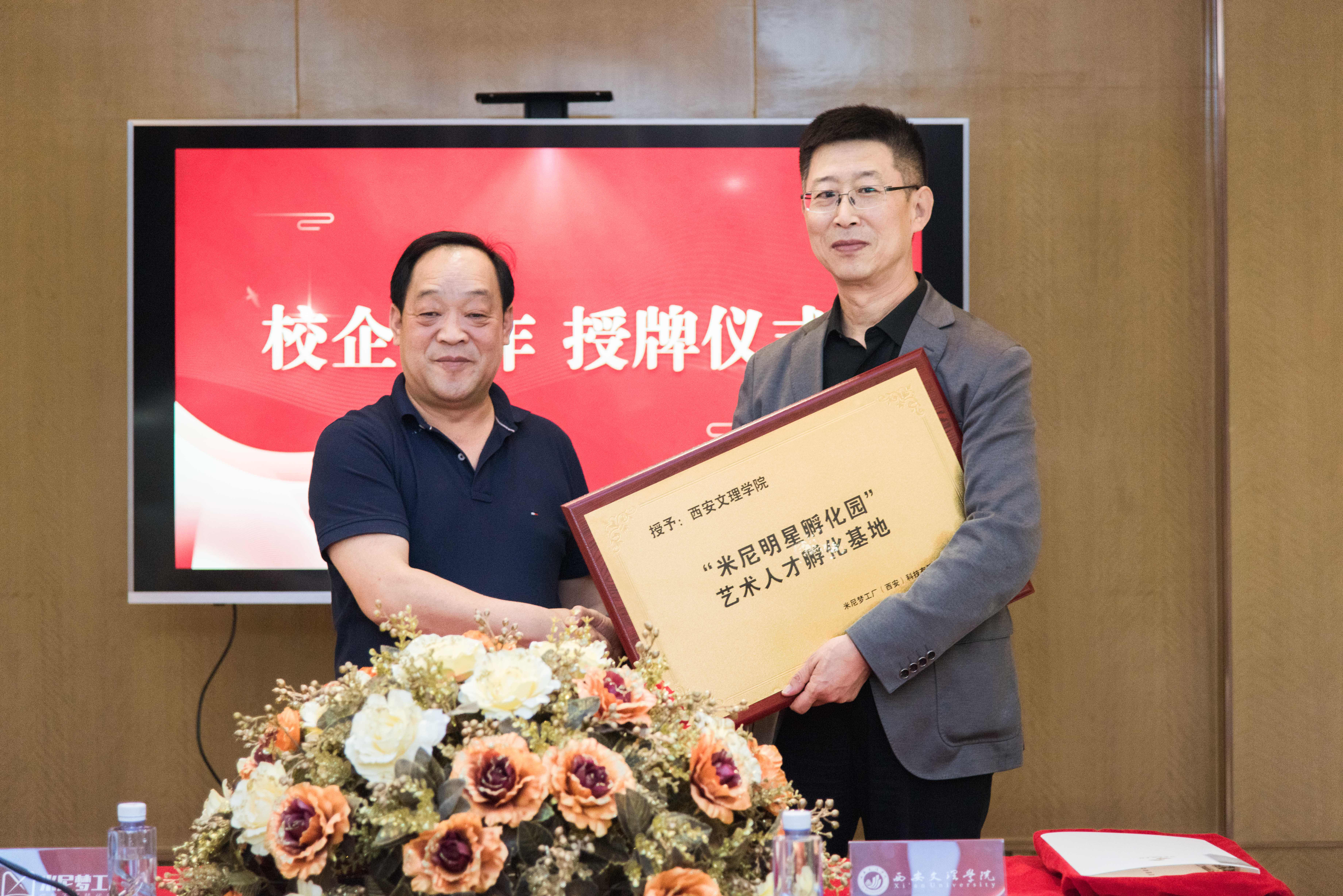 文学院院长郝延军与米尼梦工厂(西安)科技有限公司董事长黄涛分别就艺术教育校企合作发表意见,就双方如何发挥各自优势、资源互补,实现学校课堂化教育和网络平台推广及产业化应用探讨合作框架和可行性实施纲要。双方最终签署《战略合作协议书》,互授牌匾,“米尼明星孵化园-开云kaiyun官方网站艺术人才孵化基地”正式落成。
