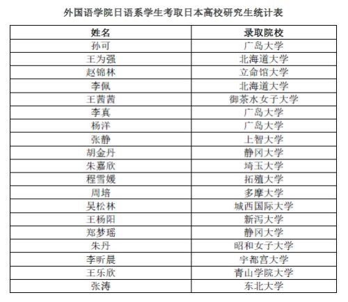 近年来,外国语学院日语系学生考取国外研究生成绩喜人。2021届王乐欣考取日本青山学院大学,攻读经营学硕士学位。2020届李欣晨考取日本宇都宫大学,成为地域创生科学研究科研究生。2017届李真考取日本广岛大学博士研究生,攻读经营学专业。