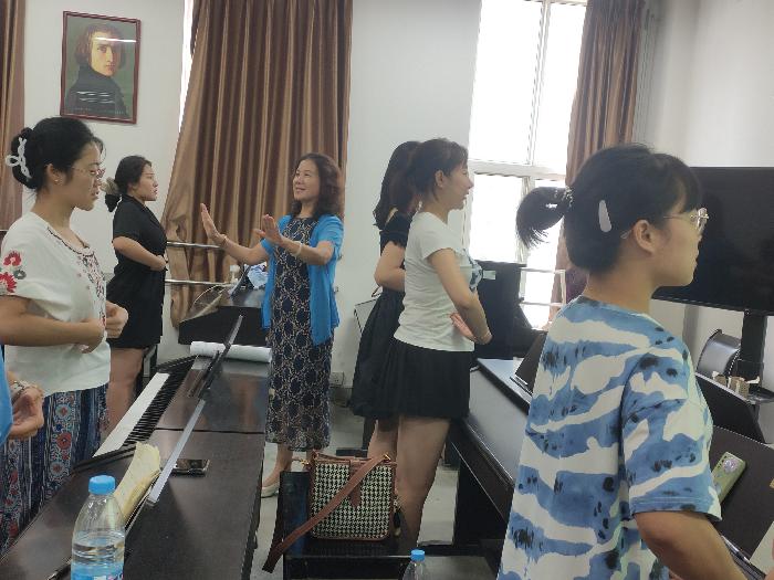 学前教育学院组织音乐教研室相关专业教师,依据幼儿园教师工作需求,在调研学员技能现状的基础上,从谈唱技能和教学活动指导等方面设计了有针对性的培训课程;由课程团队集体备课,根据场地条件,每25人为一组,分组培训;上午、下午和晚上均安排了相应的内容。