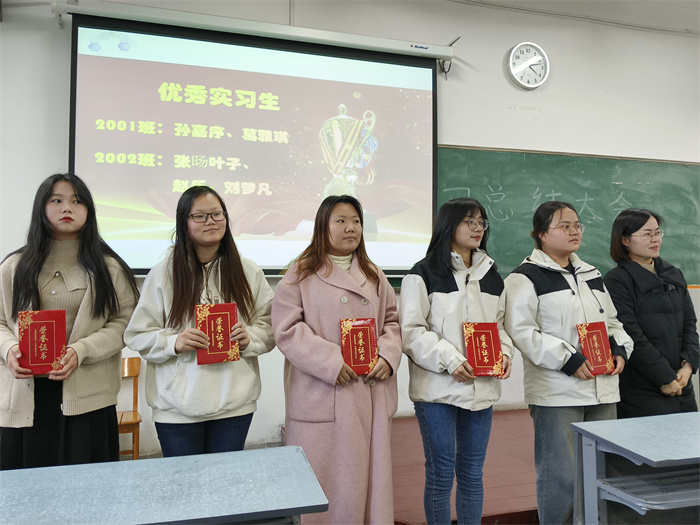 会上,焦宝娟老师介绍了参会人员后,对2020级教育实习从整体情况、实习过程、教育实习内容、结果评价和存在问题进行了介绍。宋瑞娟老师对孙嘉序、葛雅琪、张旸叶子、赵乐和刘梦凡5名校级优秀实习生颁发了荣誉证书、翟云会院长对唐永强、何亚萍两位优秀实习指导老师颁发了荣誉证书。两个班的优秀实习生代表葛雅琪和张旸叶子对自己的实习心得进行了分享,唐永强老师也从教师角度对学生在实习工作中的收获提出了建议。