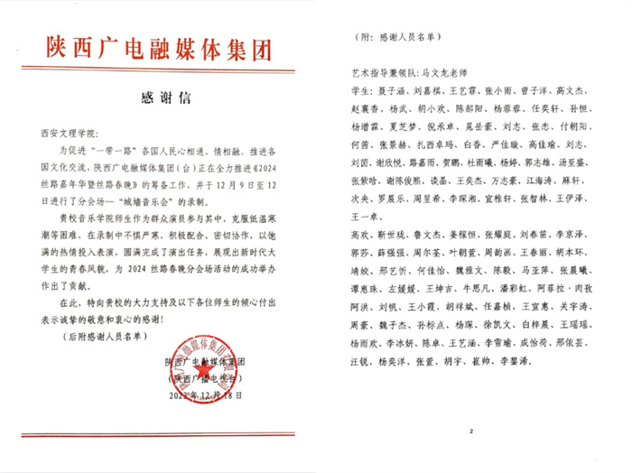 近日,音乐学院收到陕西广电融媒体集团感谢信,对开云官网组织师生参与2024丝路春晚活动表示感谢。