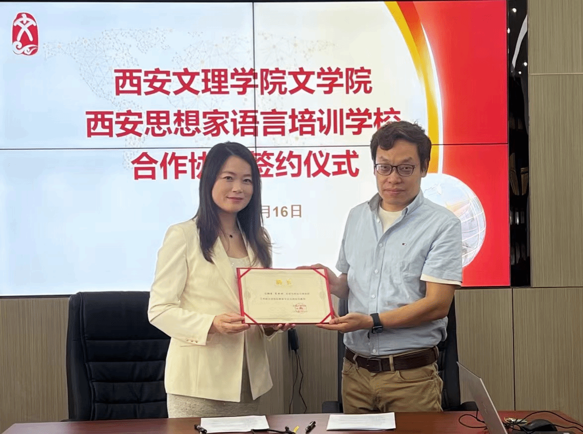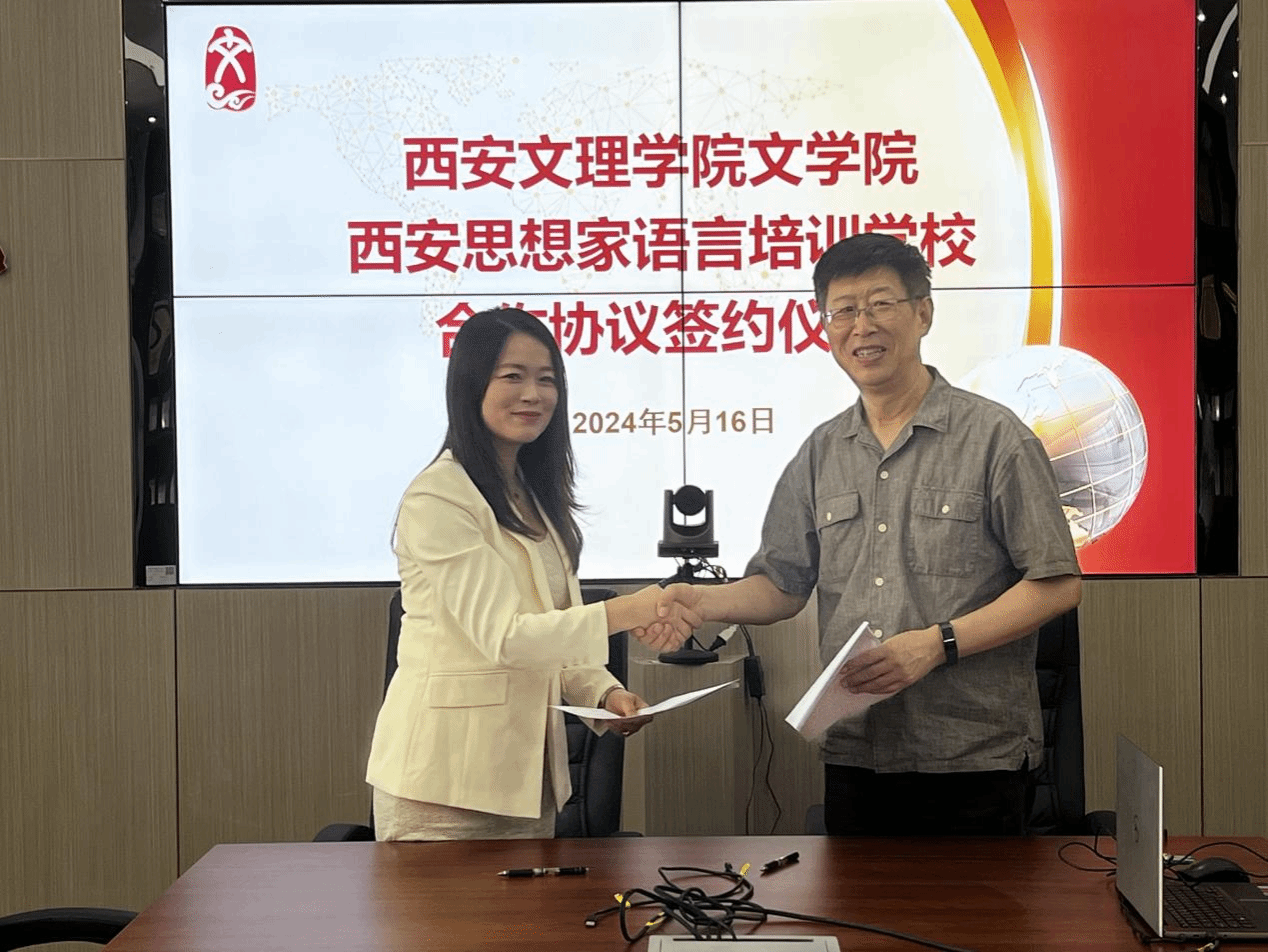 5月16日上午,开云官网文学院与西安思想家语言培训学校签订合作协议。西安思想家语言培训学校校长李盼盼及两名教师代表,文学院院长郝延军、副院长董洪杰、汉语国际教育专业系主任林贤参加了仪式。