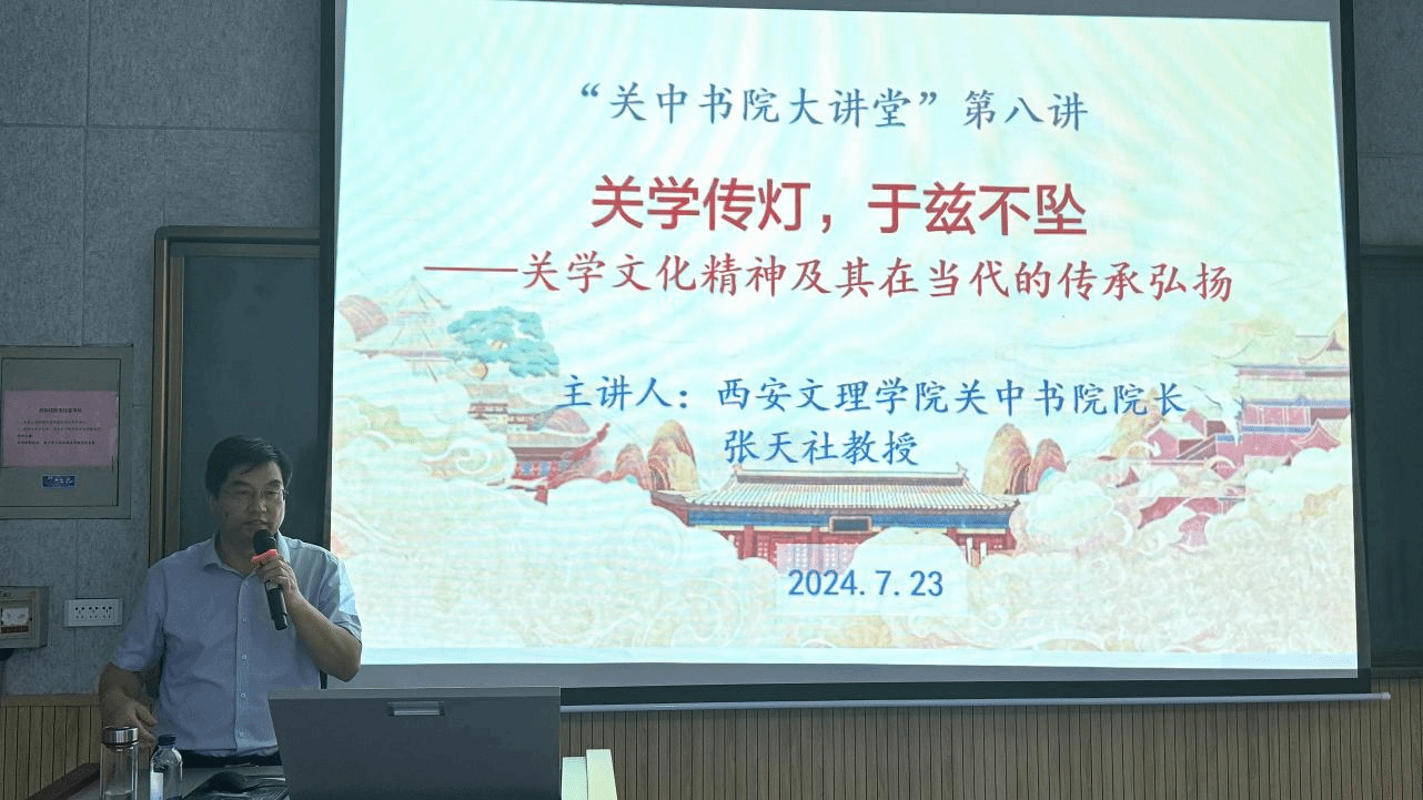 张天社以《关学传灯,于兹不坠——关学文化精神及其在当代的传承弘扬》为题,介绍了张载生平及其创立关学的时代背景,阐明了关学主要内容和历史价值,解读了关学经典名句“横渠四句”、《东铭》《西铭》等深刻含义以及吕氏乡约、关学家训等现实作用,说明关中书院是关学文化精神的重要载体,分析了关中书院历代学者传承发展关学的经过及主要贡献,重点梳理了关学崇道德、重使命、求实用、尚躬行、讲气节、贵兼容等文化精神,指出关学文化精神与社会主义文化建设的共同价值追求,强调弘扬关学文化精神在当代的重要意义。