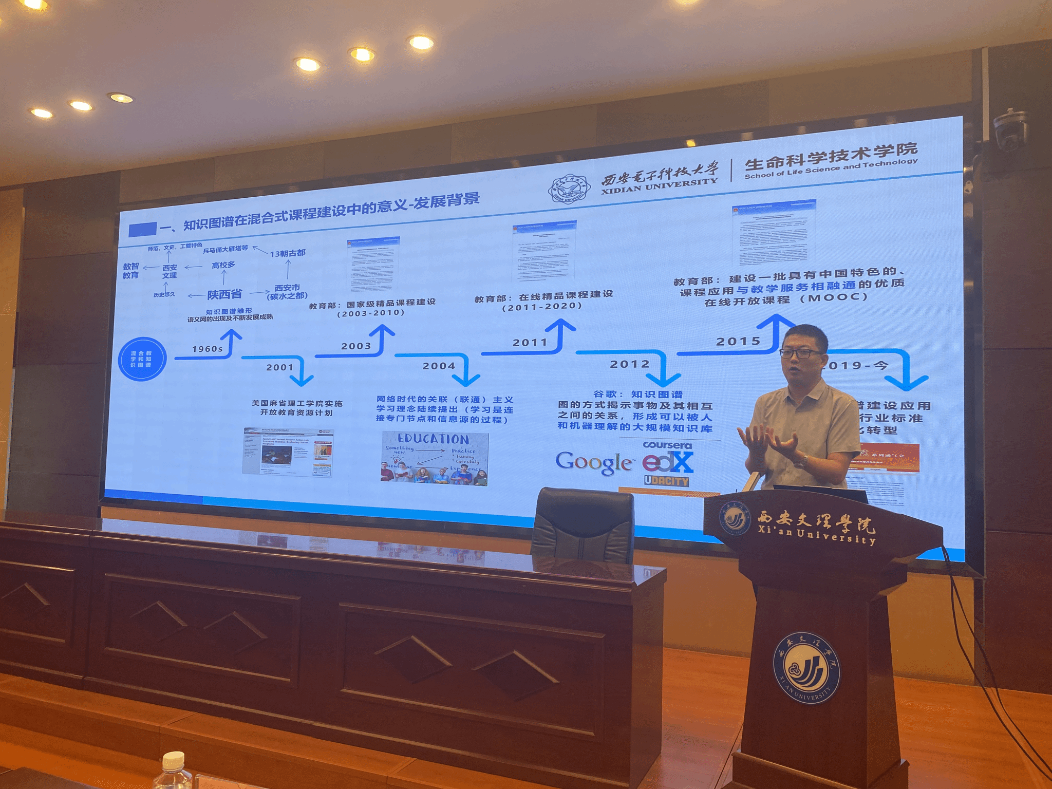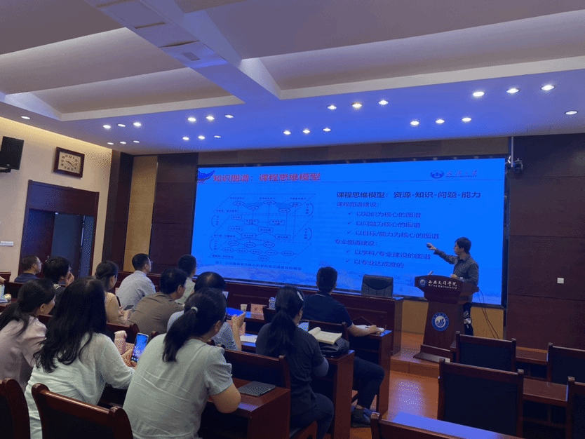 谢晖作了主题为《基于知识图谱的数智一体化课程建设及个性化育人实践》的报告,他基于知识图谱的个性化教学实践及应用案例,阐述了如何通过三层级育人搭建框架,构建的三阶段分别为:基本框架、资源部署、育人核心,并进行多维度分层教学及全过程智能评价。