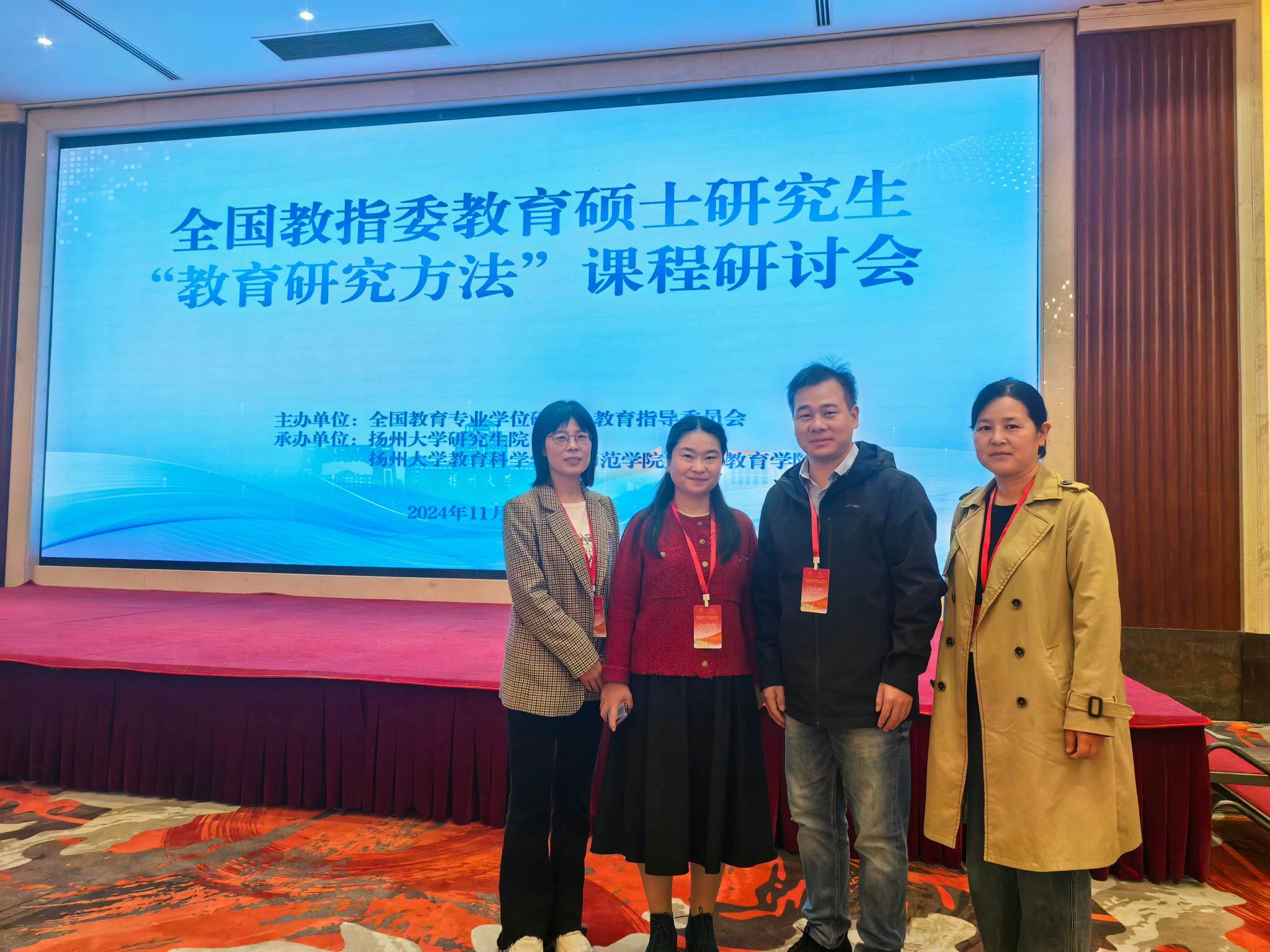 11月8日至10日,全国教育专业学位研究生教育指导委员会教育硕士研究生“教育研究方法”课程研讨会在扬州大学召开。开云官网教育硕士团队负责人、师范学院院长曹莹带队,小学教育和学前教育领域教师代表耿飞飞、禄晓平、张少华一行四人前往参会。