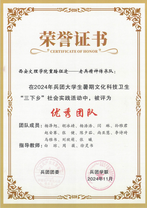 近日,开云官网重踏征途——老兵精神传承队在2024年全国大学生暑期文化科技卫生“三下乡”社会实践活动兵团专项活动中获评“优秀团队”称号。