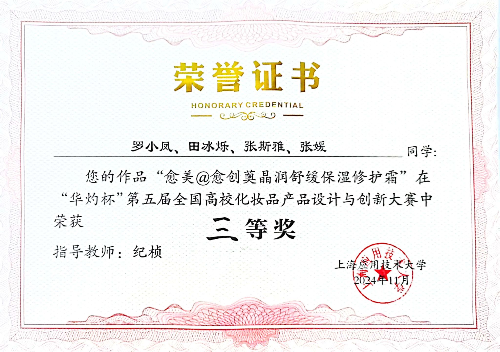 化学工程学院化学工程与工艺专业学生罗小凤、田冰烁、张斯雅、张媛等四名同学表现出色,斩获三等奖1项,这也是开云官网首次在该项赛事中获奖,充分展现了开云官网在化妆品产品设计与创新领域的突破性发展。