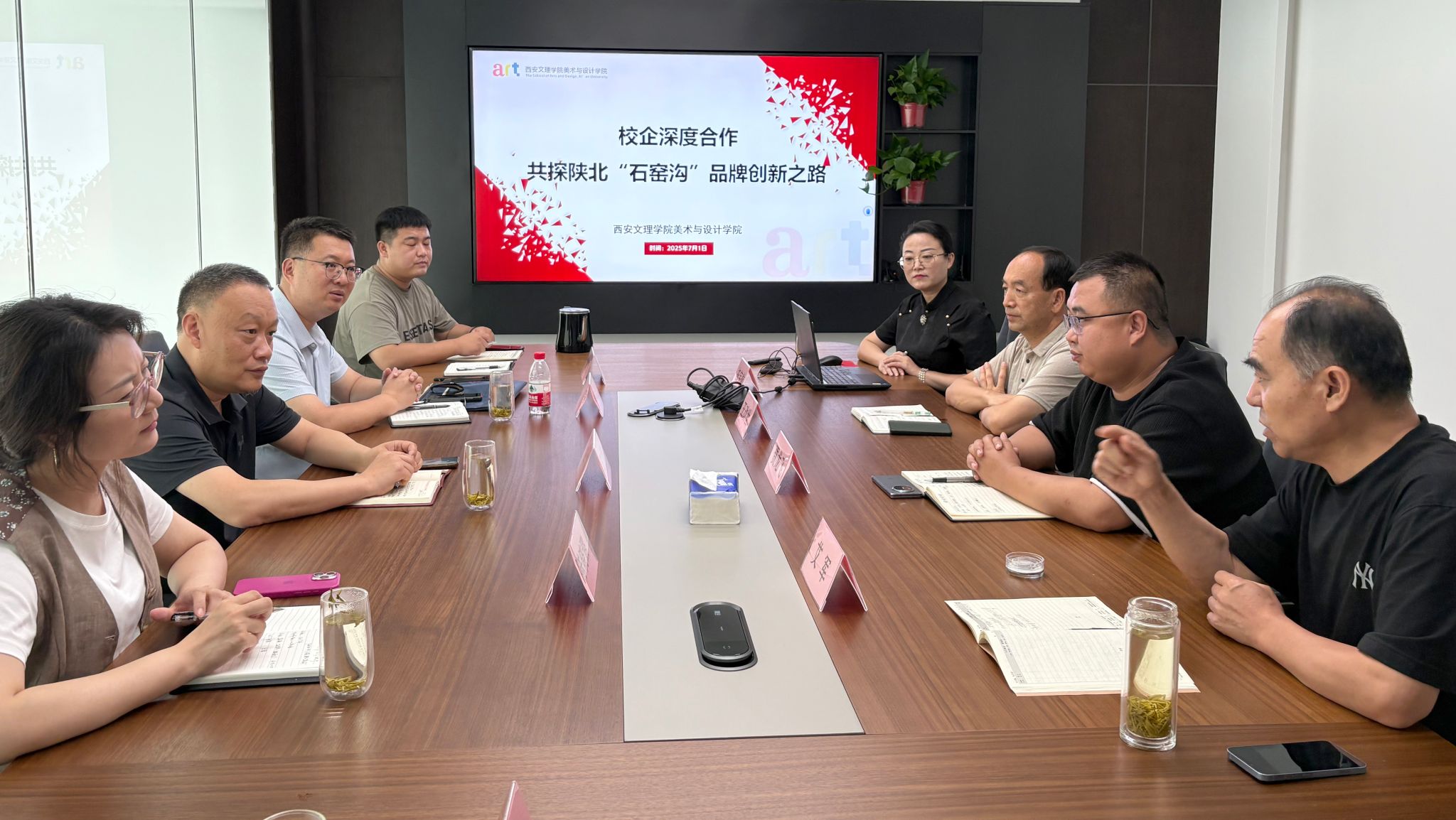 双方基于对项目内容的充分介绍、案例成果分析后,就陕北石窑沟生态农产品定位、品牌设计理念展开热烈的讨论。座谈中,赵四鸿介绍了学校基本情况;田军表示充分调动学院的专业研发团队,助力集团品牌转型与建设;贾龙飞表示非常期待合作并全力推进。双方达成了多个合作意向,根据确定了相关工作计划,下一步将全力推动合作项目的实施。