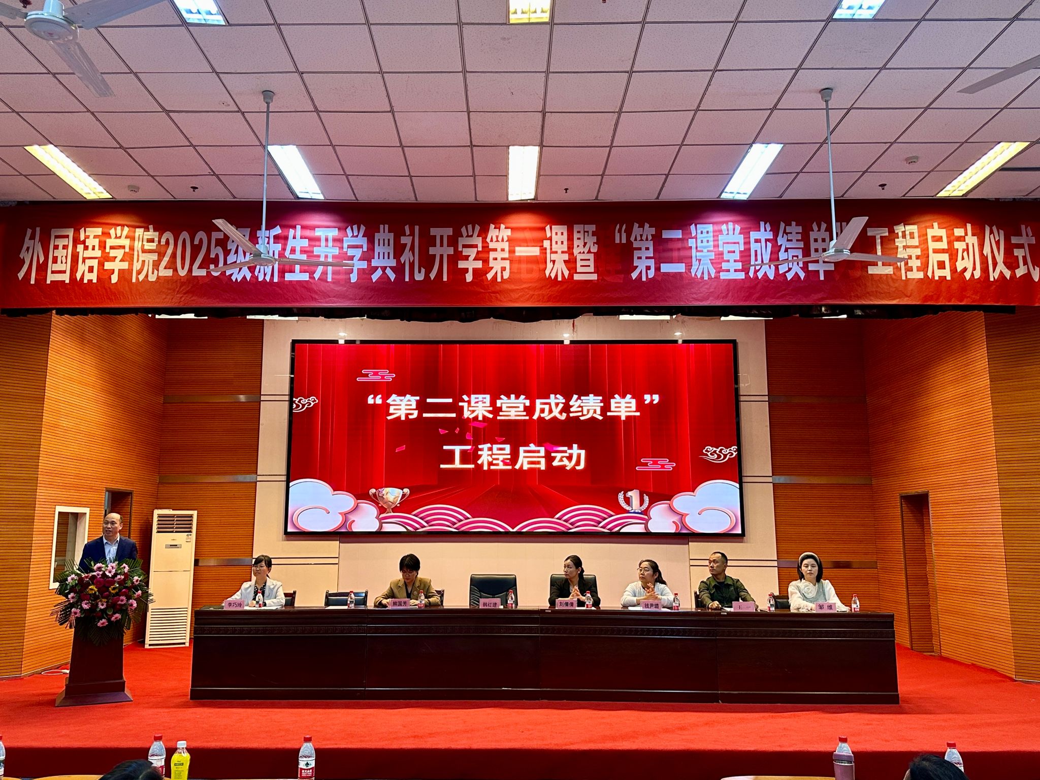 9月25日中午,外国语学院2025级新生开学典礼、开学第一课暨“第二课堂成绩单”工程启动仪式在A区报告厅举行。学工部部长刘倩倩、团委书记钱尹璐出席,党总支副书记李巧玲主持会议。