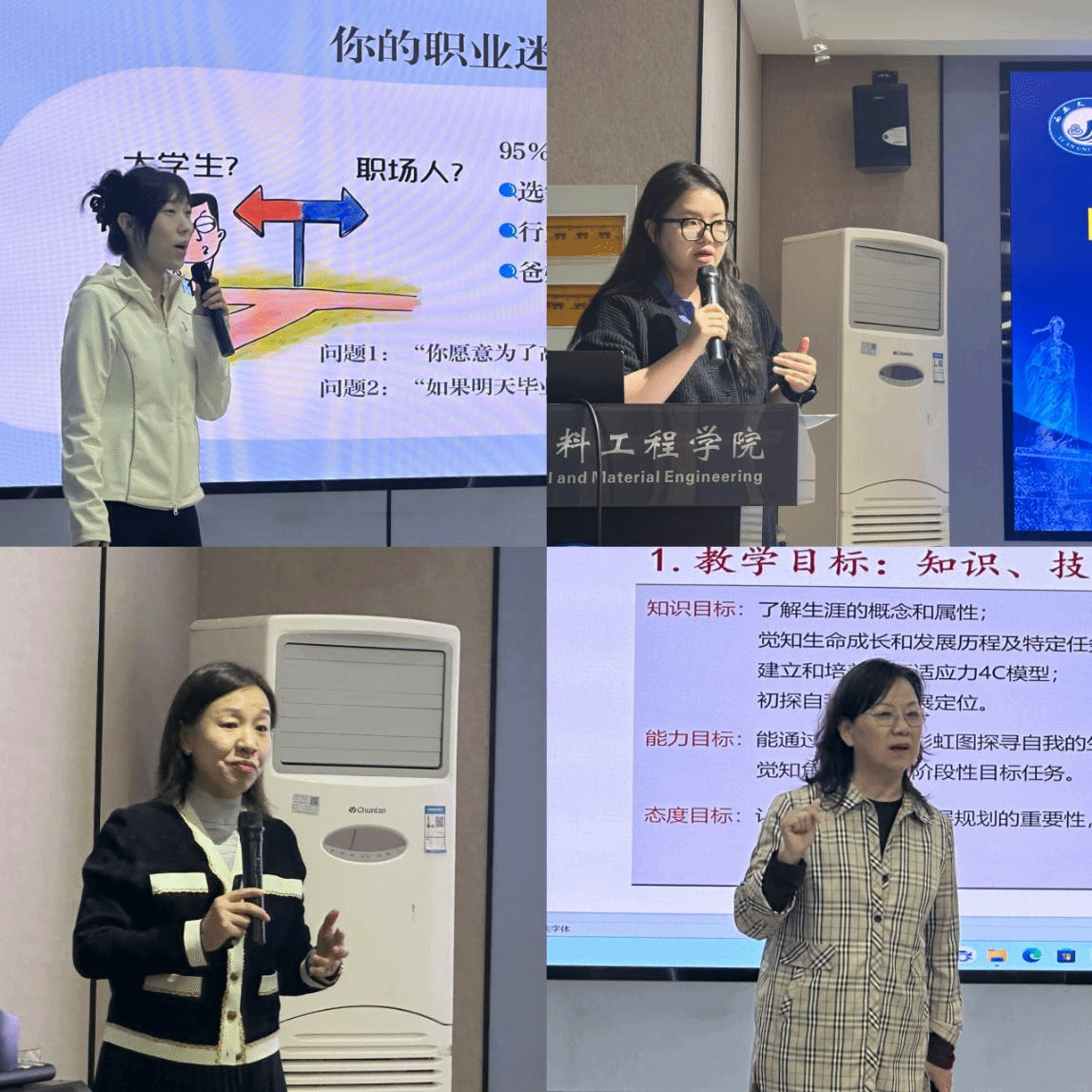 分享环节中,三位教师结合实践经验各展所长:信息工程学院任钰嘉老师从“破解学生就业迷茫”切入,剖析当代大学生职业规划痛点;美术与设计学院邹杰老师经过前期调研,围绕“大学生生涯发展核心需求”,提出适配性教学思路;马克思主义学院魏娟辉老师则紧扣“学院特色与人才培养方案融合”,分享针对性教学设计。随后,学生职业生涯发展教育中心主任冯宁以“课程教学五要素”“教学目标设定”为核心,系统解读“唤醒生涯觉知”课程的概念、核心内容、典型案例及实操方法,并与在场教师展开深度研讨,现场交流氛围浓厚。