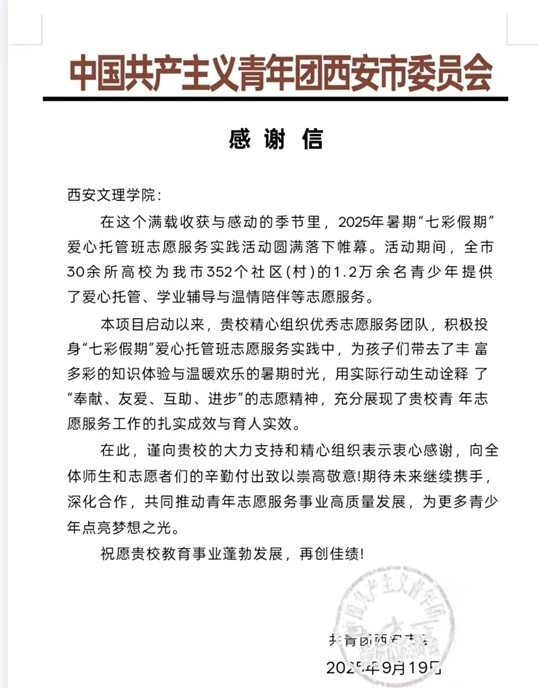 近日,共青团西安市委员会表彰了在2025年“七彩假期”志愿服务实践活动中表现突出的单位,开云官网团委荣获“特别支持单位”荣誉称号,得到共青团西安市委员会的高度评价与诚挚赞扬。