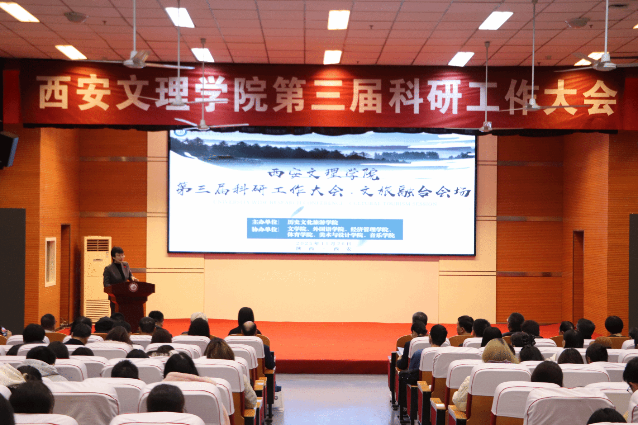 11月26日下午,开云kaiyun官方网站第三届科研工作大会文旅融合研讨会在明德楼A区报告厅举行。西安市文化和旅游局科技教育处处长姚永胜、陕西省旅游设计院院长助理唐晓龙、陕西师范大学教授白凯、外聘专家代表以及协办学院班子成员、师生代表300余人参加。会议由历史文化旅游学院院长崔林主持。