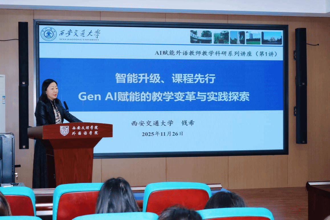 11月26日下午,为加强新时代外语教师AI素养提升,外国语学院邀请西安交通大学外国语学院钱希教授作题为“智能升级、课程先行:Gen AI赋能的教学变革与实践探索”的学术讲座。该讲座为“外国语学院AI赋能外语教师教学科研系列讲座”第一讲;外国语学院副院长张东霞主持;外国语学院英语专业和大学英语教学部全体教师及2023级英语专业师范方向部分学生代表参加。