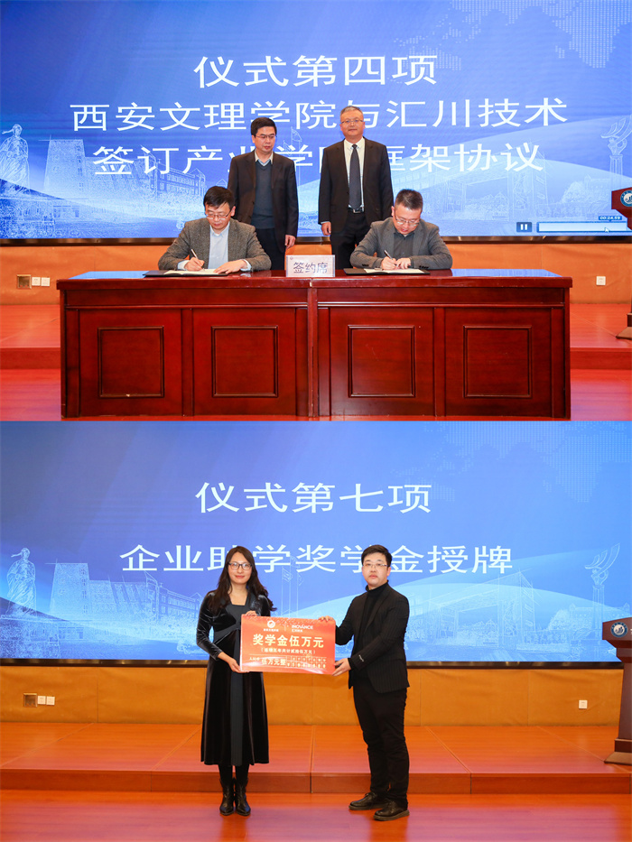 会上,汇报了产业学院共建方案,双方代表签订了有关产业学院框架、课题开发以及企业定制班三个协议,进行了企业助学金授牌。按照协议,企业每年向学校提供5万元,建设期内不低于25万元的企业奖学金。