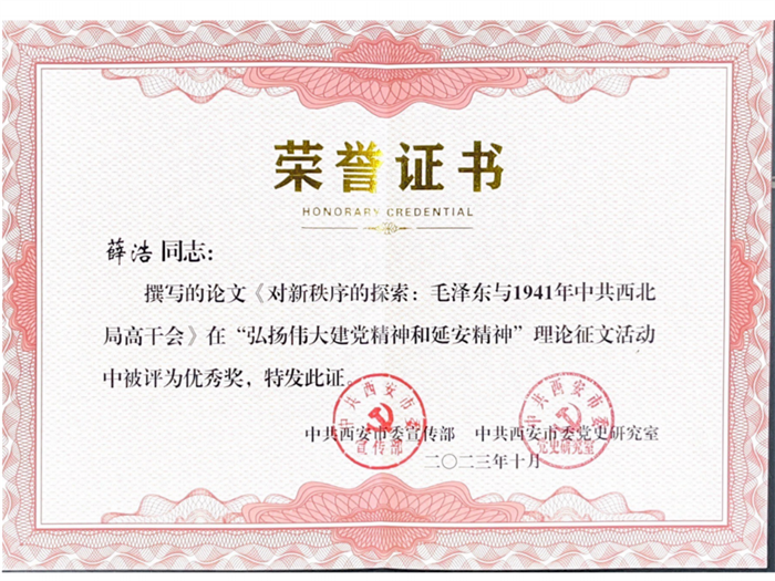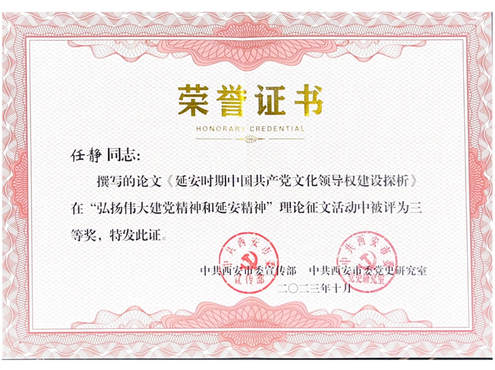 中共西安市委宣传部关于表彰“弘扬伟大建党精神和延安精神”获奖论文的通报,马克思主义学院任静提交的《延安时期中国共产党文化领导权建设探析》、薛浩提交的《“对新秩序的探索”:毛泽东与1941年中共西北局高干会》分别获三等奖和优秀奖。