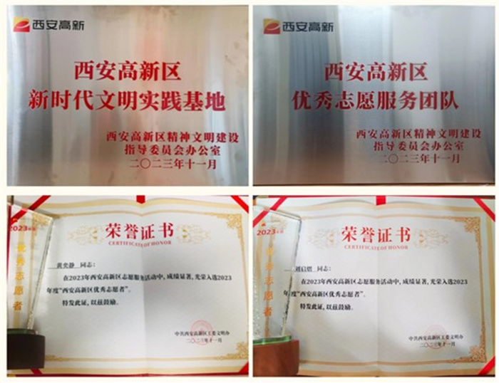 2023年西安高新区精神文明建设典型发布会上,学校被授予“高新区新时代文明实践基地”,学校“青年志愿者协会”被授予高新区优秀志愿服务团队,师范学院黄奕静、机材学院刘启熠两名同学被评为“优秀志愿者”。