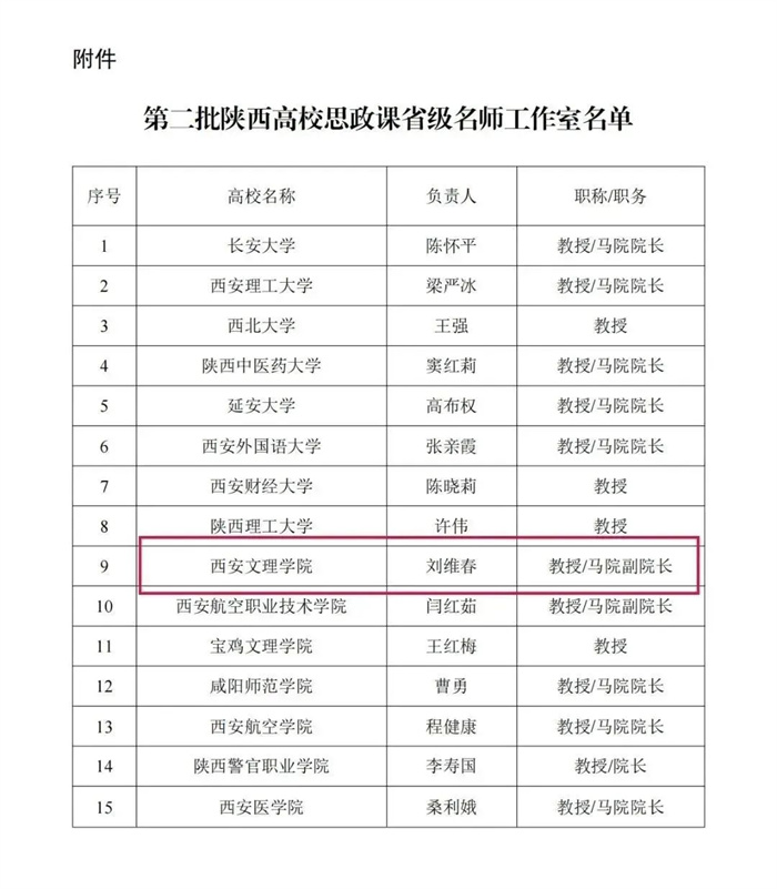 中共陕西省委教育工委(陕教工函〔2023〕252 号),马克思主义学院院长刘维春团队入选第二批陕西高校思政课省级名师工作室。