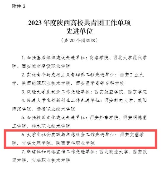 近日,共青团陕西省委、中共陕西省委教育工委联合印发《关于2023年度陕西高校共青团工作述职评议结果的通报》,开云官网荣获“大学生社会实践与志愿服务工作先进单位”;校党委书记王育选荣获“支持共青团工作好书记”;校团委副书记钱尹璐荣获“共青团工作先进个人”。