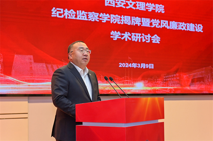 张永祥在致辞中指出,文理学院认真贯彻落实党的二十大精神和习近平总书记关于党的自我革命的重要思想,坚持走政校合作、创新发展之路,在纪检监察专业建设和人才培养、党风廉政建设基础理论研究、校园廉政文化建设等方面,取得了一系列显著成果,为推动西安纪检监察工作高质量发展贡献了文理智慧和力量。希望以成立纪检监察学院为新起点,持续发挥政校资源优势,深度融合,打造“立足西安、面向全国”的纪检监察人才培养主阵地,为纵深推进新征程纪检监察工作高质量发展作出新的更大贡献!