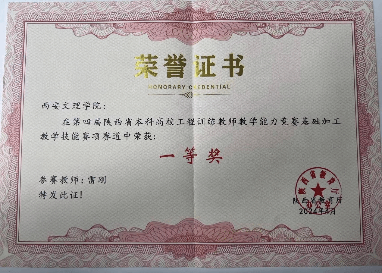 近日,由陕西省教育厅主办、西北工业大学、陕西省高等学校教学指导委员会实验实训工作委员会协办的第四届陕西省本科高校工程训练教师教学能力竞赛在西安理工大学举办。全省18所高校的86支参赛队伍、160余名教师参加竞赛。机材学院校企合作教师雷刚参加了基础加工教学技能赛道,喜获“省级一等奖”。