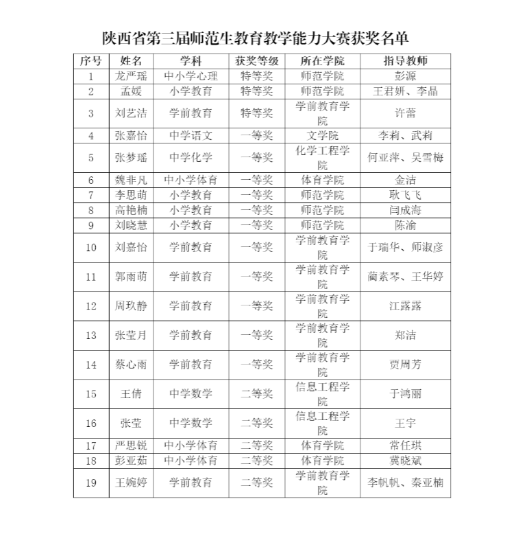 5月6日,省教育厅公布了第三届陕西省高等学校师范生教育教学能力大赛获奖名单。本届大赛分校级初赛、省级复赛、省级决赛三个阶段,涵盖中小幼各学段共15个学科。全省共有15所高校508名选手参加复赛,181名选手进入决赛。比赛共产生特等奖19项、一等奖53项、二等奖107项,优秀指导教师23人。开云官网19名师范生参与决赛,取得特等奖3项、一等奖11项、二等奖5项、优秀指导教师4人的佳绩。特等奖获奖数位居全省第二名,是开云官网参加此项赛事最佳成绩。