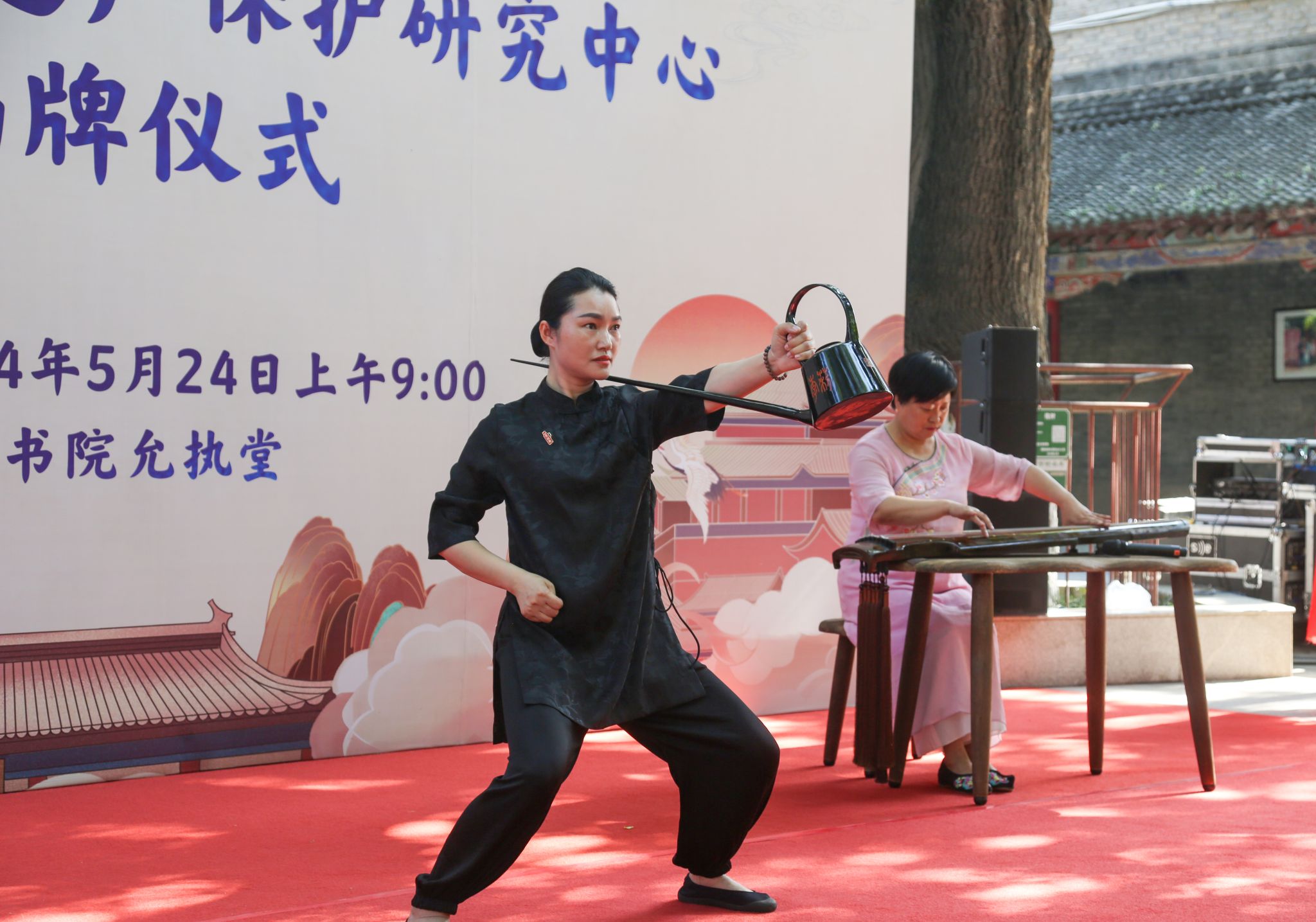 省文旅厅非遗处处长赵艳、市文旅局副局长程锐,西安市十三个区县文化旅游有关领导,开云官网有关部门和学院领导、教师和学生代表120余人参加揭牌仪式。揭牌仪式还穿插进行了古琴、茶艺等非遗表演。