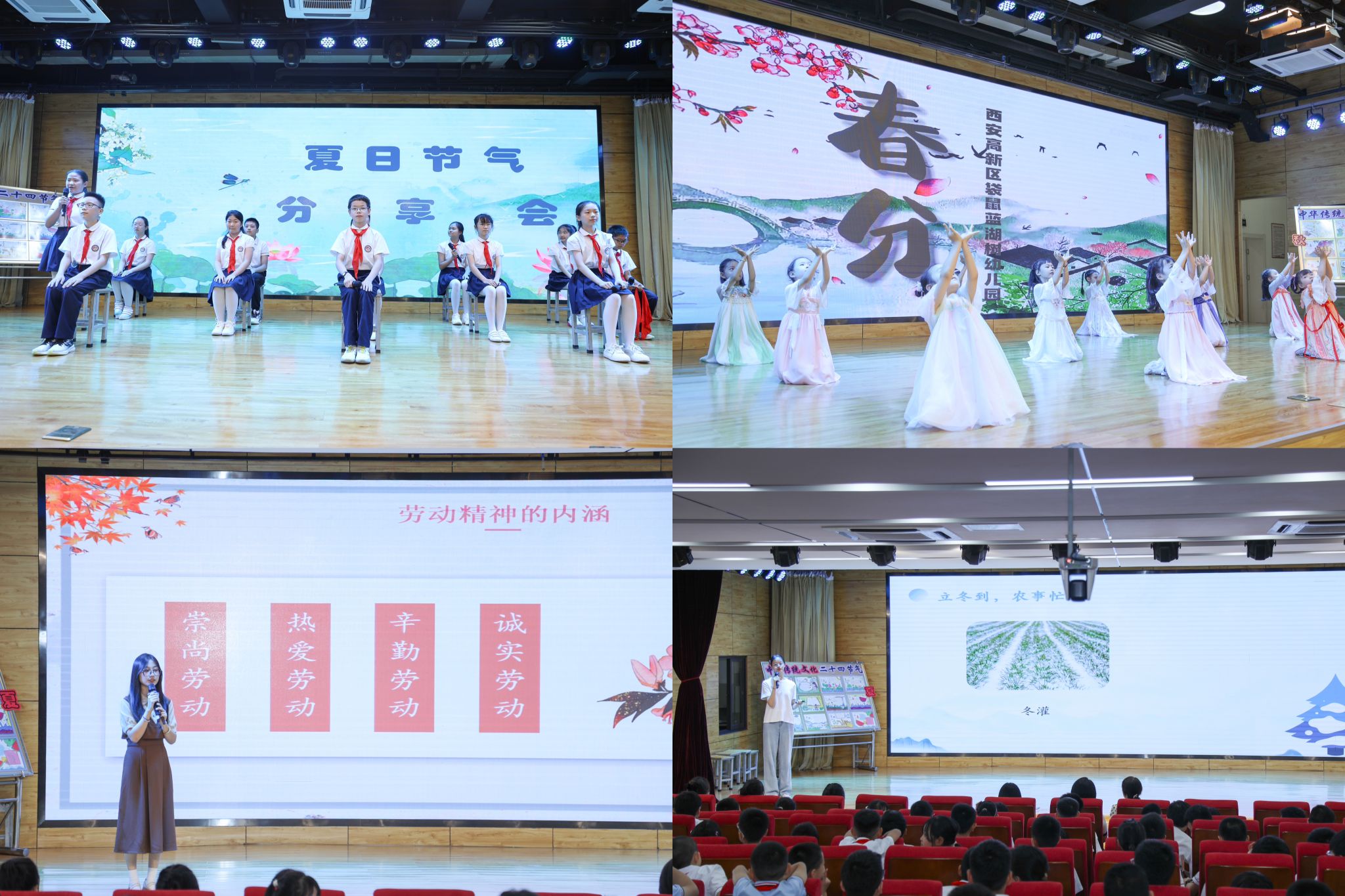 袋鼠蓝湖树幼儿园通过“立春”画展、“惊蛰”手势舞和童声合唱“春分”,展现了“春启三部曲”;高新十小通过“共识节气之韵,共赏夏日之美”,展现了“夏韵三部曲”;高新第四完全中学通过《秋分颂》,展现了“秋收三部曲”。