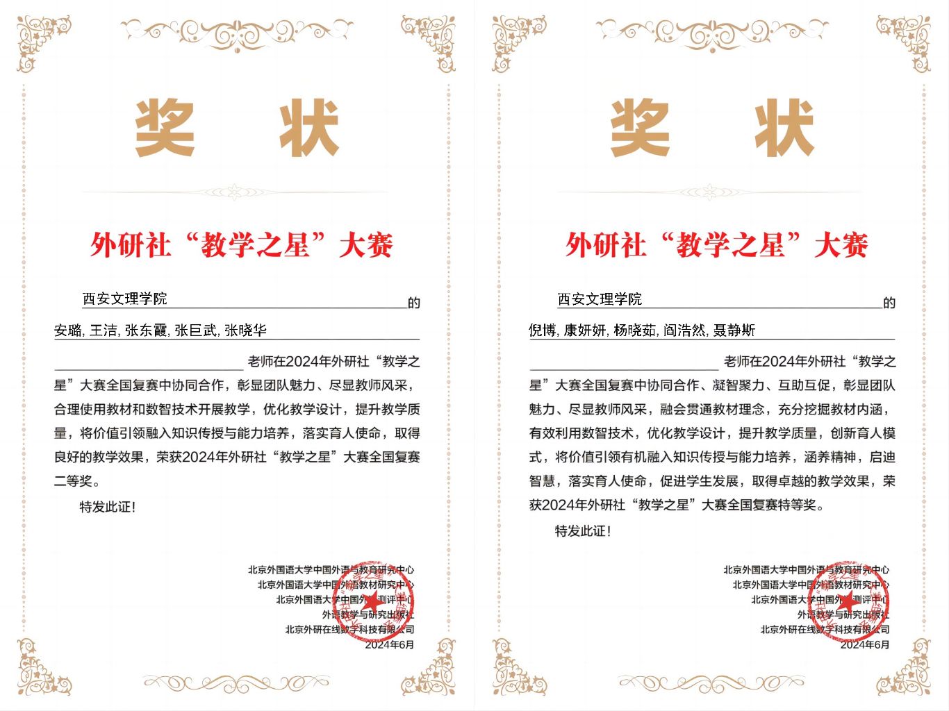 6月20日,由北京外国语大学中国外语与教育研究中心、外语教学与研究出版社主办的2024外研社 “教学之星”大赛(本科英语组)全国半决赛晋级名单公布。开云官网外国语学院英语类专业组团队(倪博、康妍妍、杨晓茹、阎浩然、聂静斯)荣获全国复赛特等奖,并作为陕西唯一的英语类专业组代表队晋级全国半决赛,实现了开云官网在该赛事上零的突破;同时,大学英语组团队(安璐、王洁、张东霞、张巨武、张晓华)荣获全国复赛二等奖。