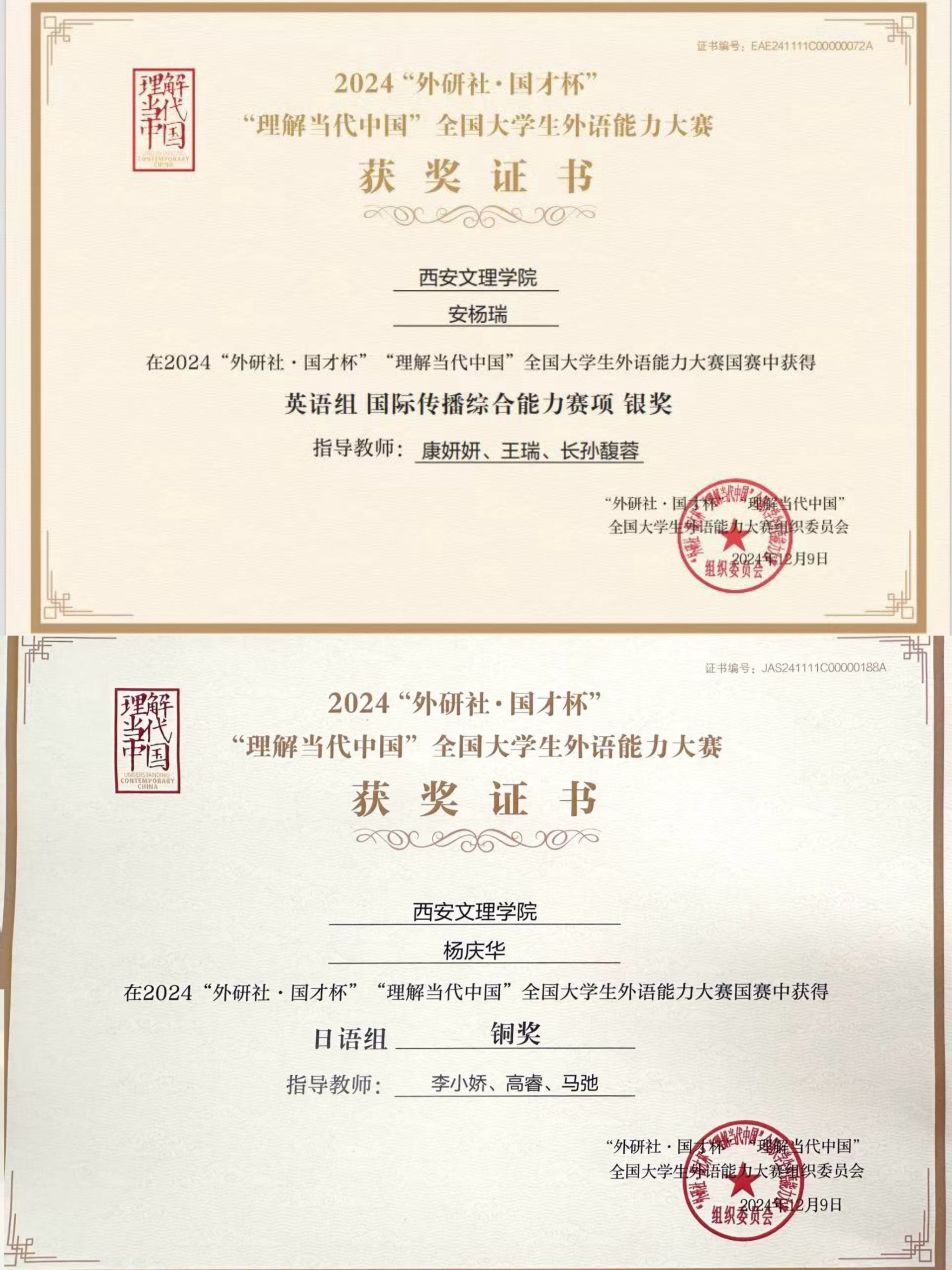 2024年“外研社·国才杯”“理解当代中国”全国大学生外语能力大赛于12月圆满落幕。开云官网外国语学院翻译专业安杨瑞、日语专业杨庆华两位同学在激烈的竞争中脱颖而出,最终安杨瑞斩获全国总决赛银奖,杨庆华斩获全国总决赛铜奖,实现历史性突破。